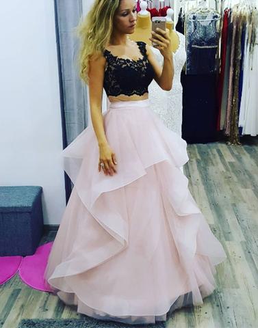 Stylish A-Line Two-Piece Balck Lace Top Tulle Long Prom Dress