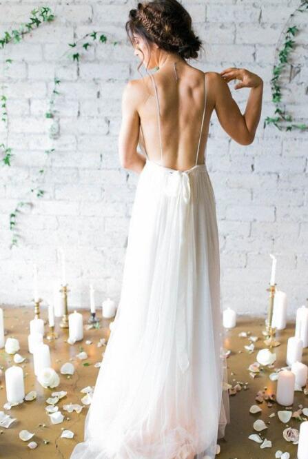 Wedding Dress,Ivory Plunging V Neck Straps Wedding Dress,Backless Long Prom Dress