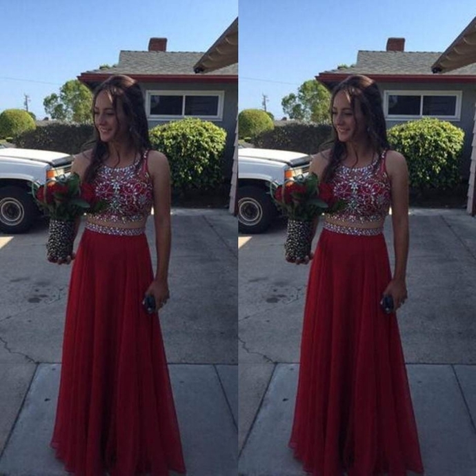 Red Beading Floor-length Chiffon Prom Dresses 2017