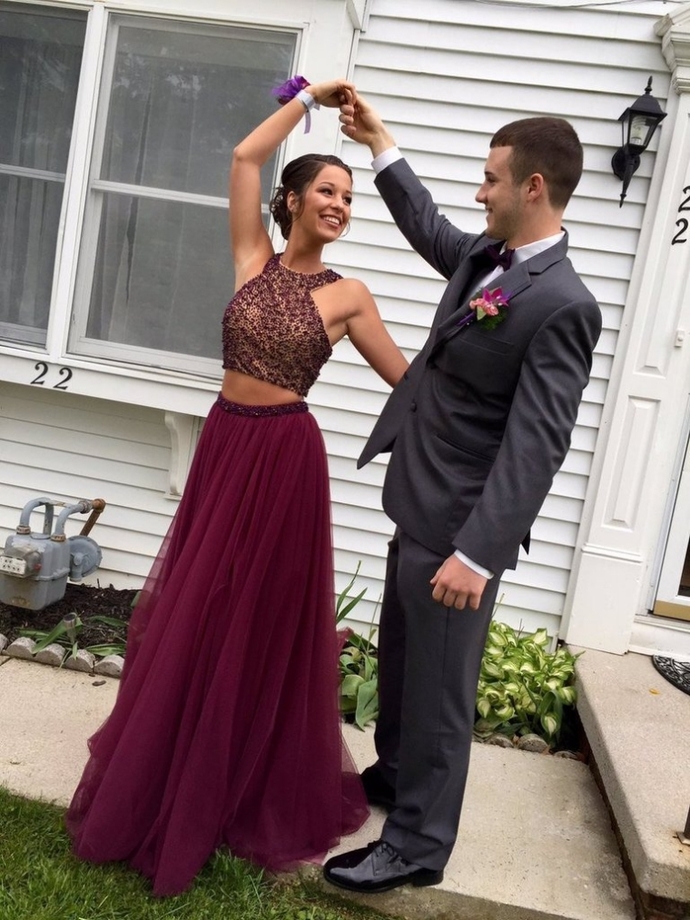 Sheath/Column Halter Sleeveless Floor-Length Tulle Prom Dresses 2017
