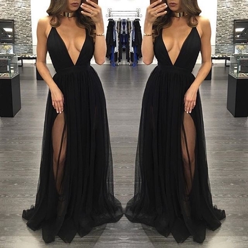 Black Deep V-neck Tulle Long Prom Dresses,Evening Dress,Formal Dress