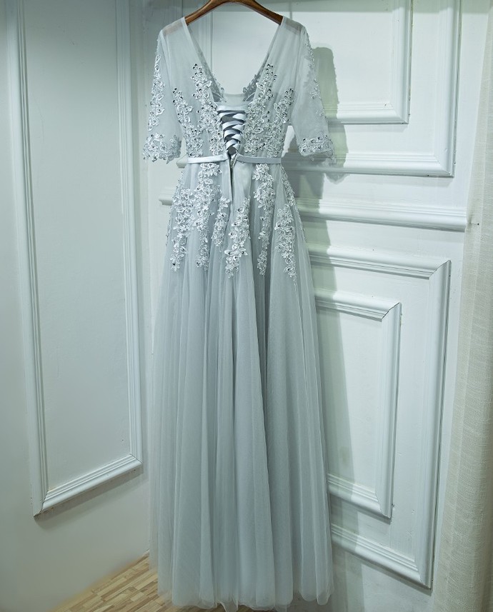Beautiful Half Sleeves Lace Prom Dress, Sexy V Neck Prom Dress, Tulle Prom Dress, Floor Length Prom Dress, Full Length Evening Dress,