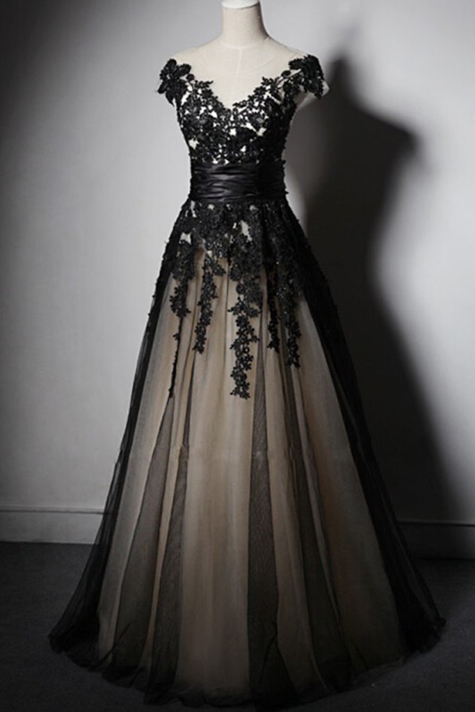 Black tulle lace applique V neck see-through A-line long prom dresses,formal dresses