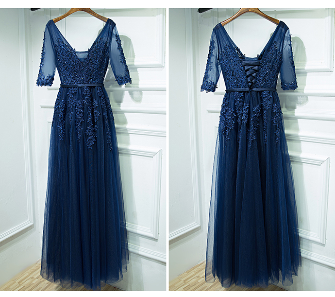 Elegant Prom Dress,Half Sleeve Appliques Prom Dress,Tulle Long Dress for Prom,Vintage Evening Dress,Formal Evening Dresses