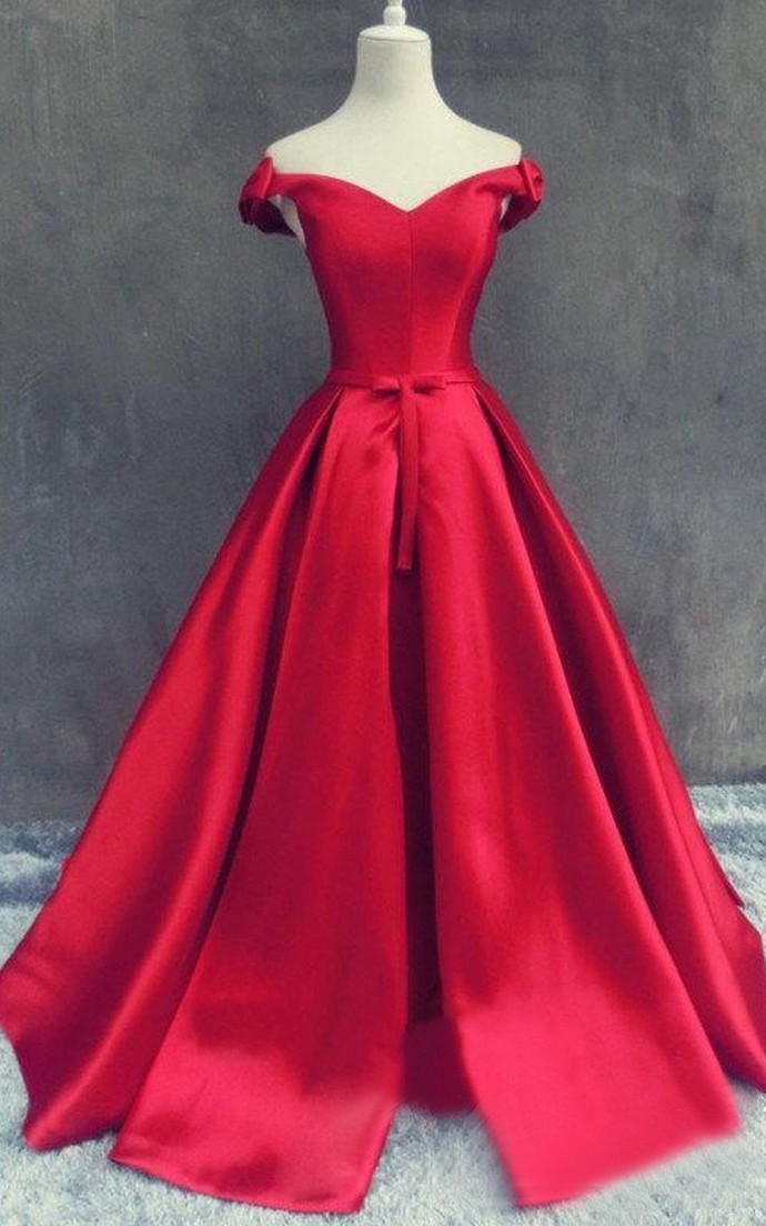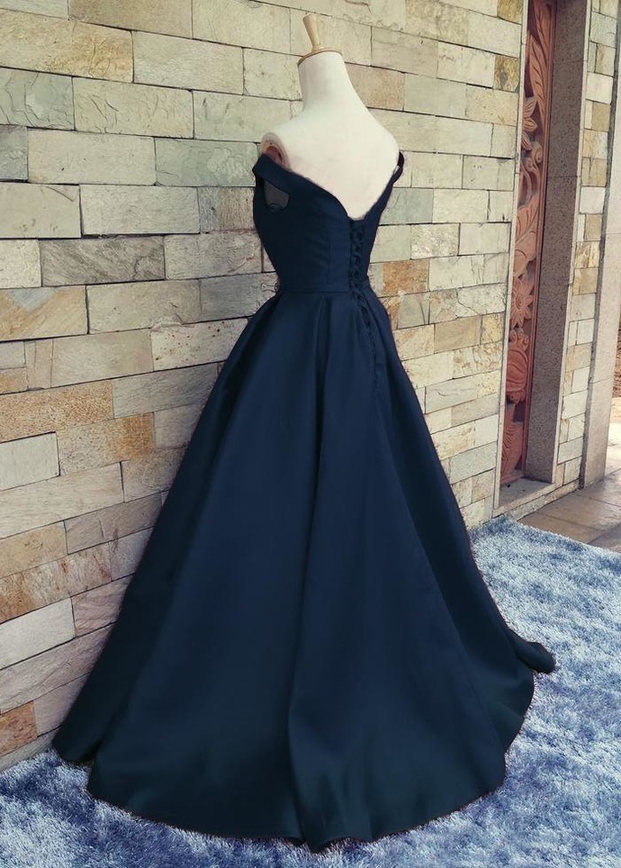 Charming Dark Navy Blue A Line Prom Dresses Satin Off The Shoulder Evening Gowns With Belt And Pleat