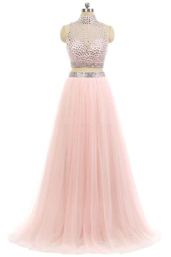 Elegant pink chiffon beading two pieces high neck A-line long prom dresses evening dresses