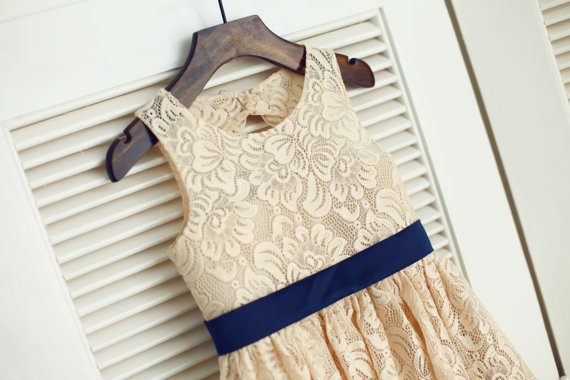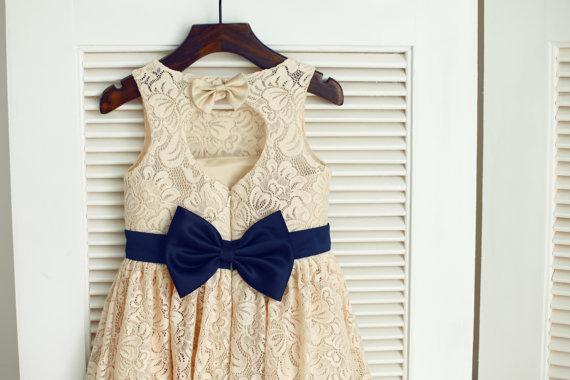 Champagne Lace Navy Blue Sash Bow Keyhole Backless Open back Flower Girl Dress Children Toddler Dress for Wedding Junior Bridesmaid Dress