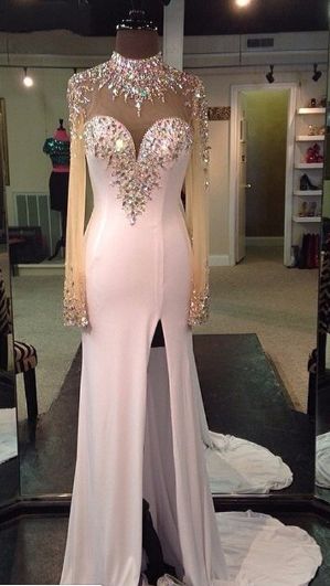 Prom Dress,Sexy Long Sleeve Prom Dress,Crystal Mermaid Evening Dress,High Low Evening Gown