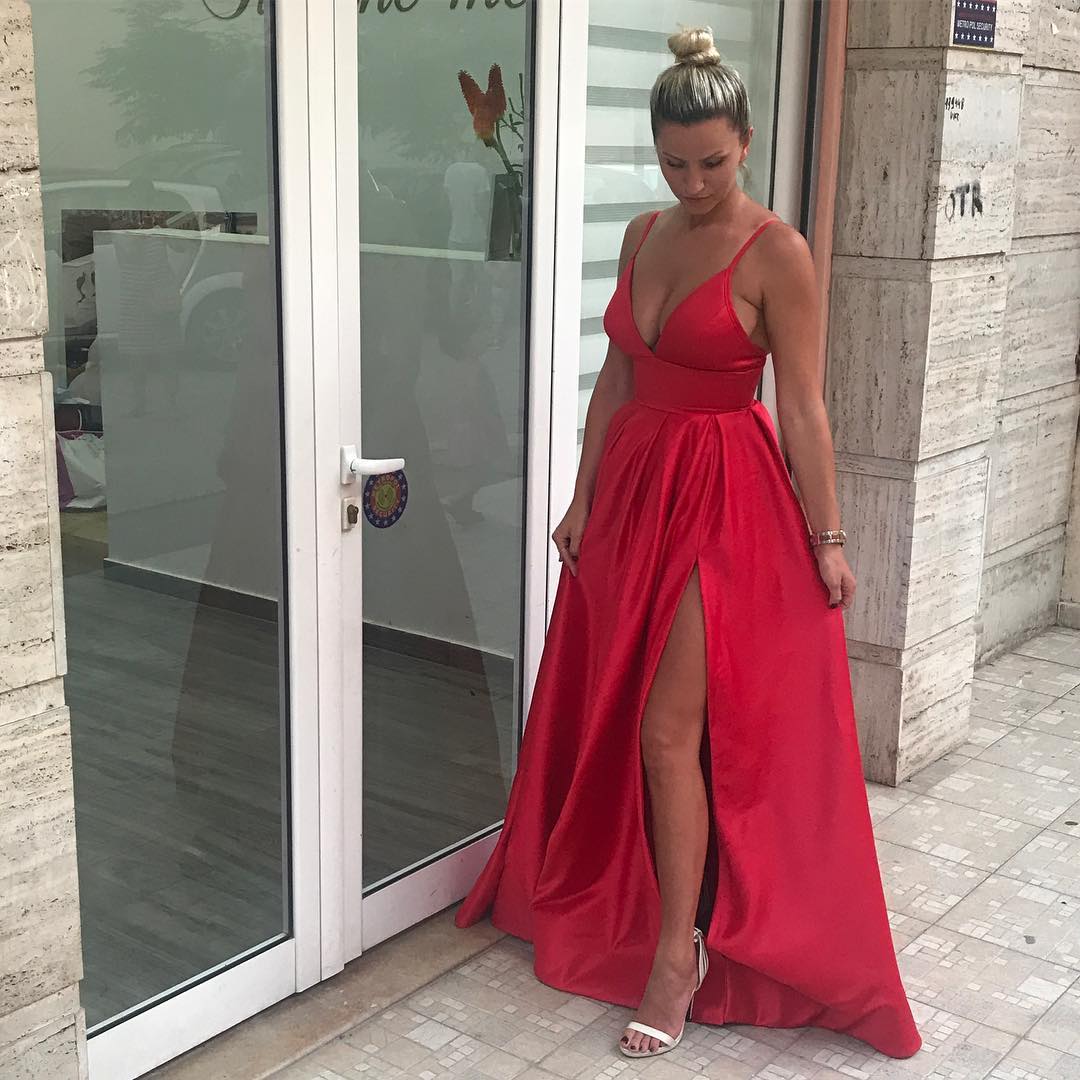Deep V neck Sexy Side Slit Satin Evening Prom Dresses Long in Black Color