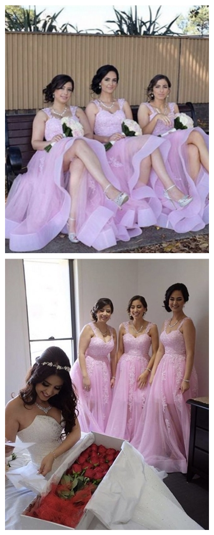 Pink Straps Appliques A-Line Long Bridesmaid Dresses
