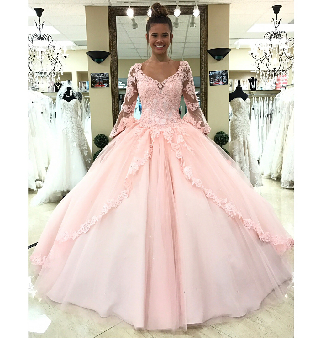 Sexy long sleeve pink tulle wedding dress,appliques lace ball gown wedding dresses, formal wedding gown