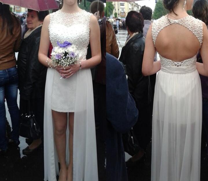 White High Low Beaded Open Back Homecoming Dresses, White Prom Dresses, Graduation Dresses