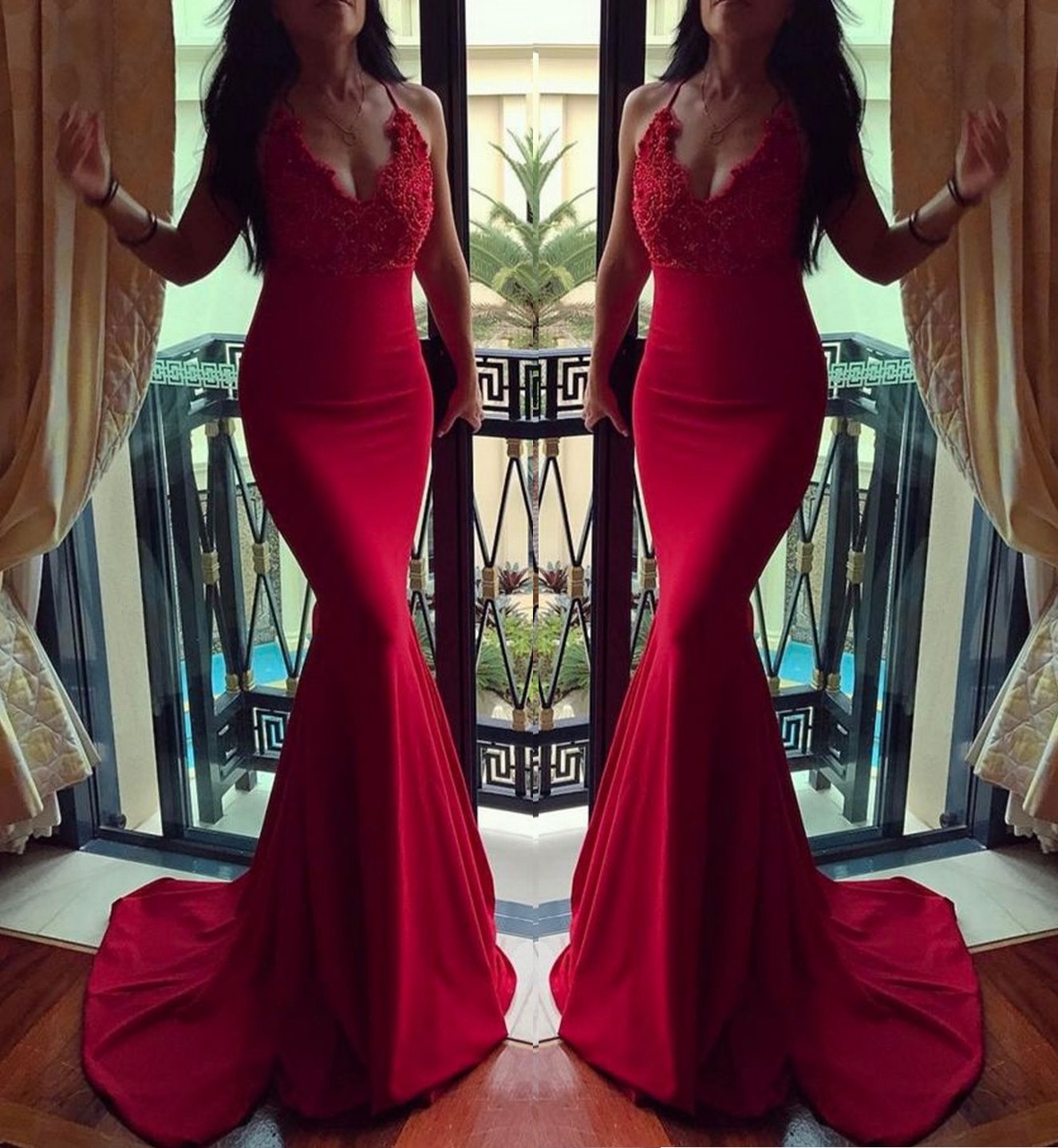 red mermaid v neck Spaghetti straps evening dress,long prom dress,elegant prom dresses appliques formal dresses