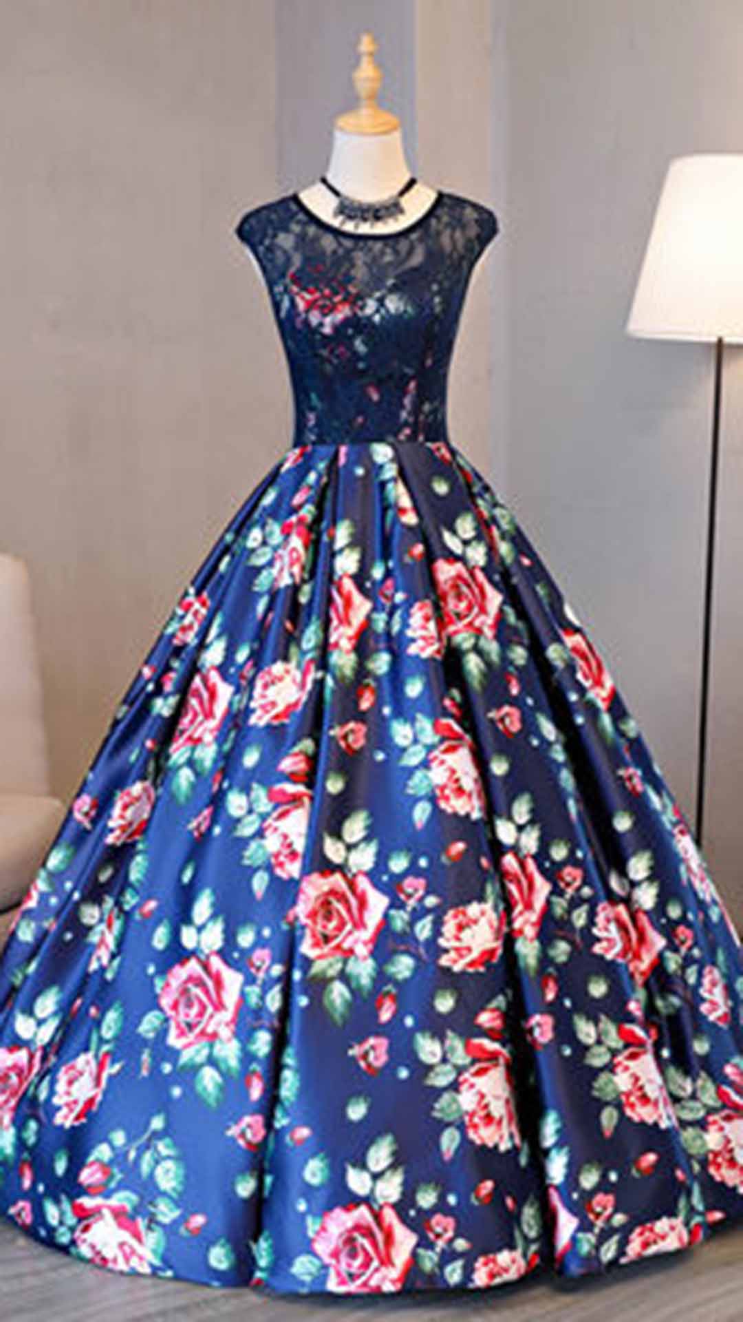 Luxury Prom Dresses, Printing Flowers Prom Gown,Cap Sleeve Prom Dress, Ball Gown Prom Dress, Custom Pageant Lace Dress