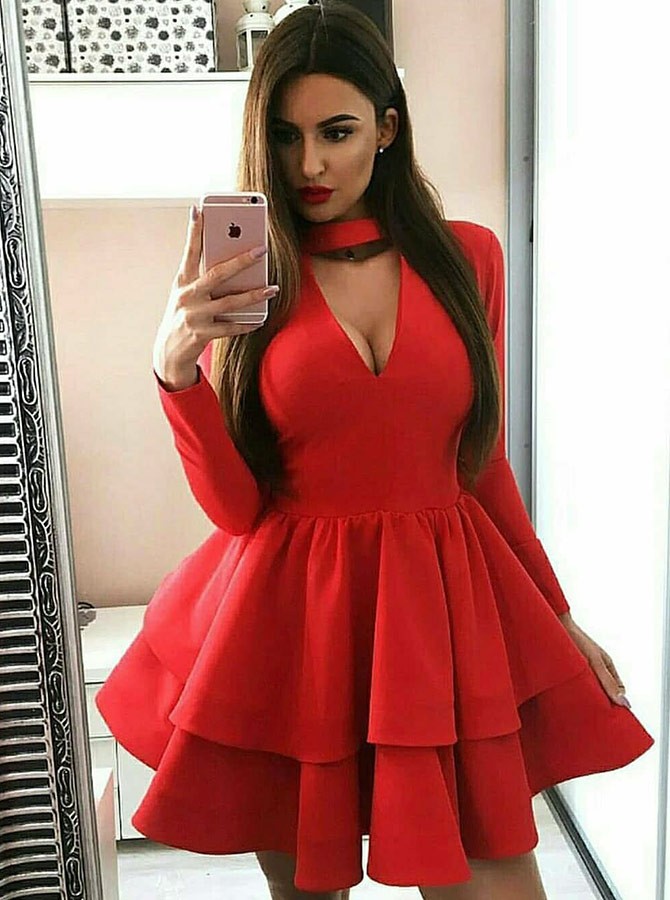 A Line V Neck Halter Open Back Long Sleeves Red Short Homecoming Dresses