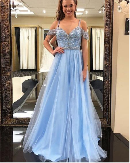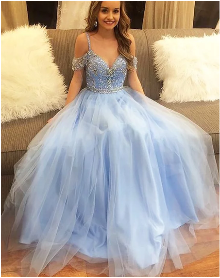 A-line Off-the-Shoulder Beaded Light Blue Tulle Prom Dress ,Cheap Prom Dresses