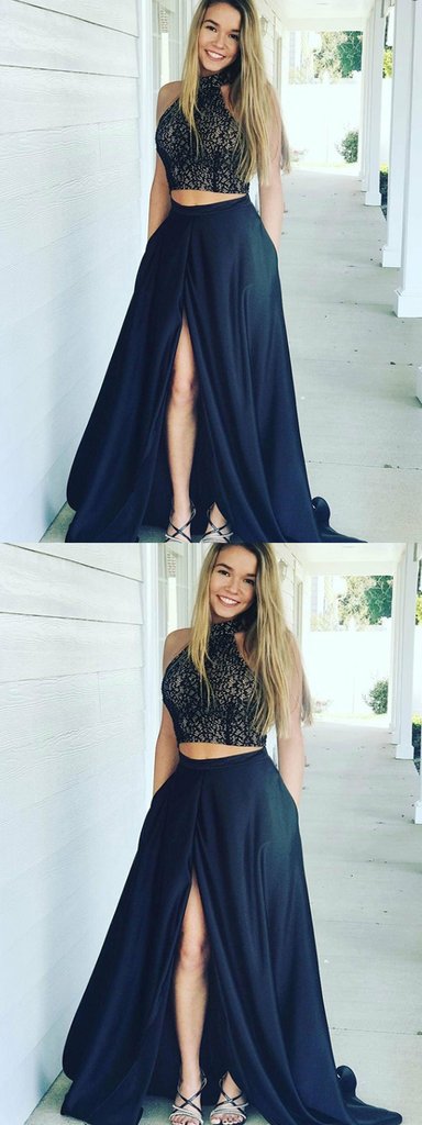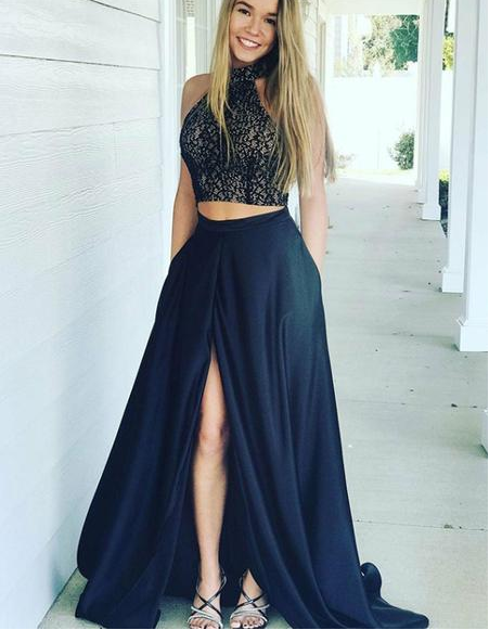 Two Piece Dark Blue Satin Prom Dress With Lace Split ,Cheap Prom Dresses