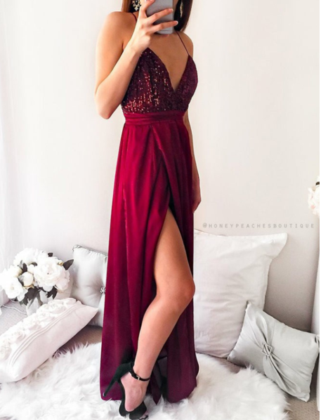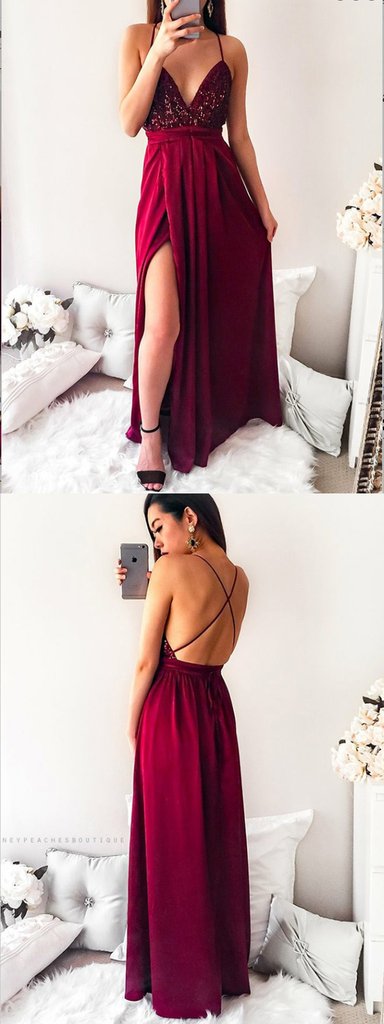 Spaghetti Straps Dark Red Long Prom Party Dress With Sequins,Cheap Prom Dress