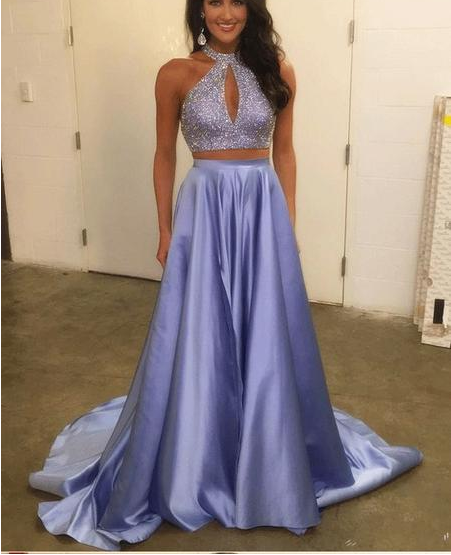 Two Piece Beaded Purple Satin Prom Dresses ,Cheap Prom Dresses