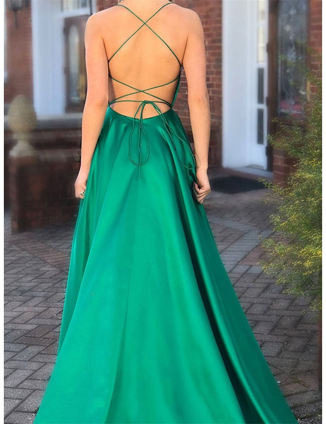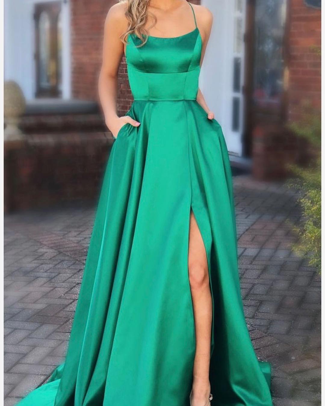 Green Prom Dresses with Pocket Long Backless Slit Formal Evening Ball Gowns, TYP1225