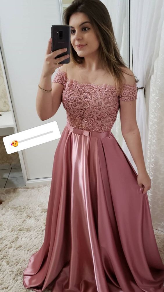 Off the Shoulder Pink Short Sleeves Lace Fancy Prom Dresses Formal Evening Dress