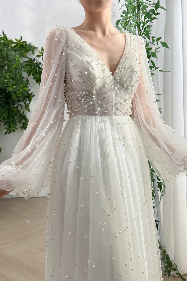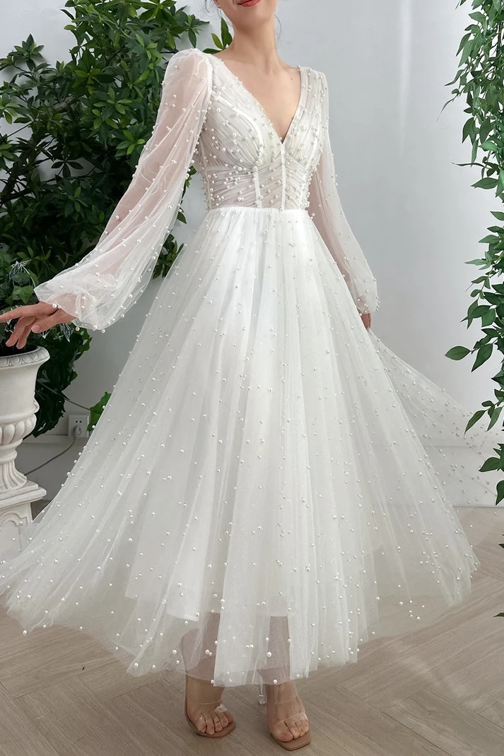 Add a touch of elegance to your wardrobe with our Long Puffy Sleeves Corset V Neck Beaded Tulle Midi Dress. The intricately beaded tulle fabric and figure-flattering corset waist will make you stand out in any event. Stay comfortable and stylish all day with the flowing midi length and soft puffy sleeves.