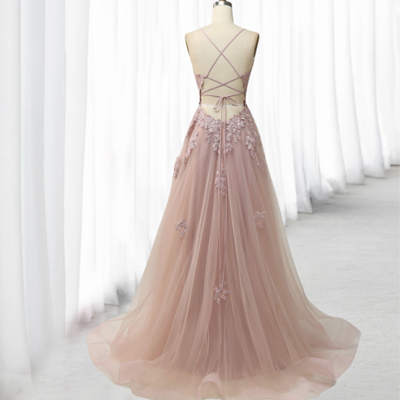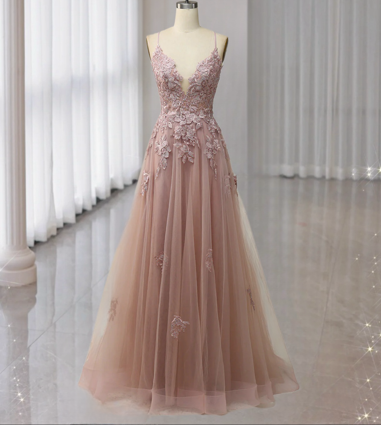 Luxe coral A-line spaghetti strap long ball gown with appliques prom dress